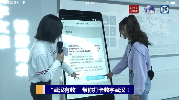 湖北廣電主播與法國在漢留學(xué)生來到鄂旅投集團(tuán)數(shù)字展廳詳細(xì)了解了“一部手機(jī)游湖北”項目亮點(diǎn)及核心功能,并現(xiàn)場體驗(yàn)文旅場所分時預(yù)約、門票酒店預(yù)訂、5G直播、智慧導(dǎo)覽等功能。