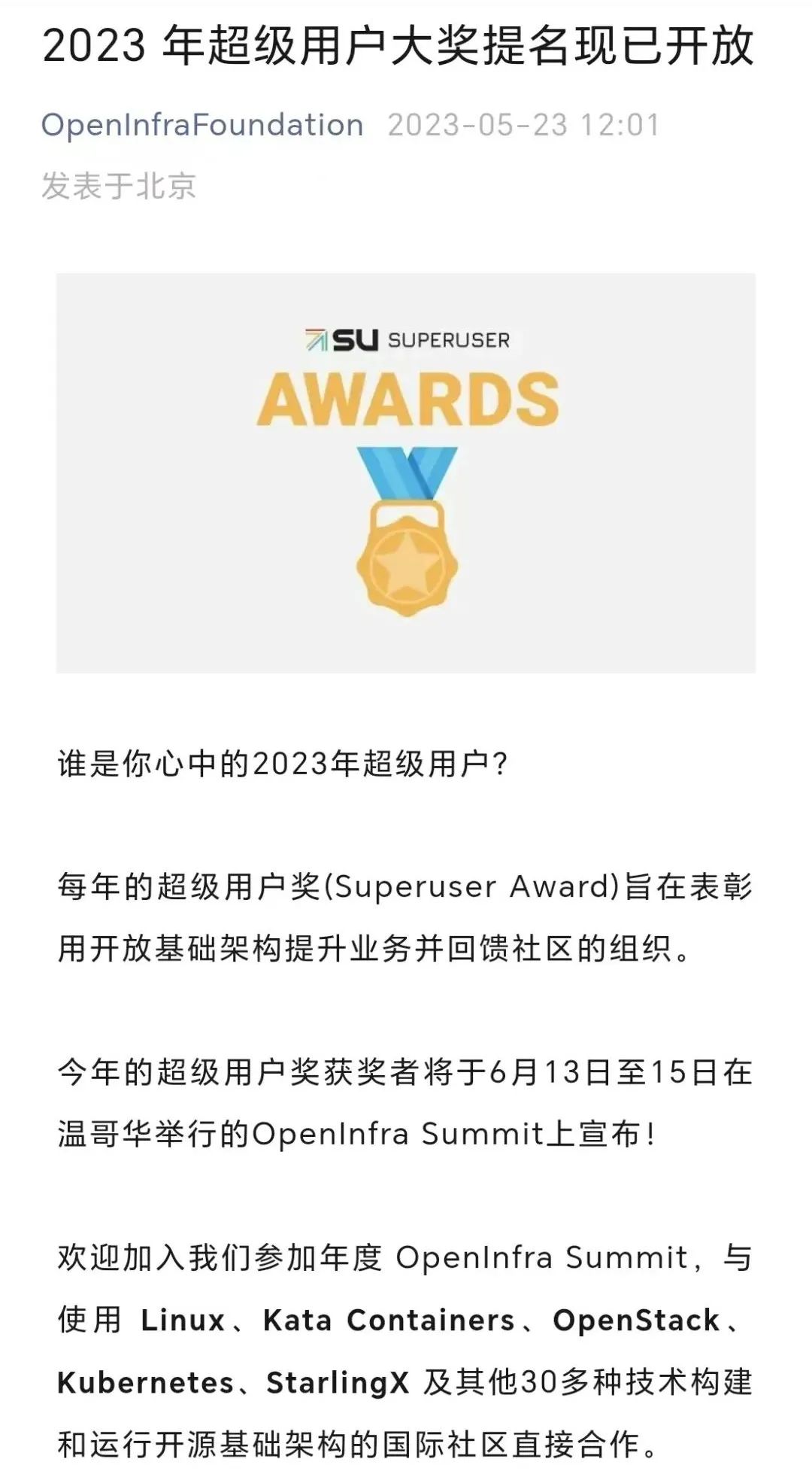 超級(jí)用戶(hù)大獎(jiǎng)由OpenInfra基金會(huì)2014年在巴黎峰會(huì)首次頒發(fā),旨在表彰在激烈的競(jìng)爭(zhēng)中采用開(kāi)源基礎(chǔ)設(shè)施技術(shù)脫穎而出,顯著改進(jìn)業(yè)務(wù)并實(shí)現(xiàn)差異化競(jìng)爭(zhēng)優(yōu)勢(shì),積極回饋開(kāi)源社區(qū)的團(tuán)隊(duì)組織。在業(yè)界,超級(jí)用戶(hù)大獎(jiǎng)是備受全球關(guān)注的重量級(jí)評(píng)選,被稱(chēng)之為云計(jì)算領(lǐng)域的奧斯卡。歷屆超級(jí)用戶(hù)大獎(jiǎng)獲得者包括中國(guó)移動(dòng)、雅虎、百度、SK電信、騰訊TStack團(tuán)隊(duì)等。