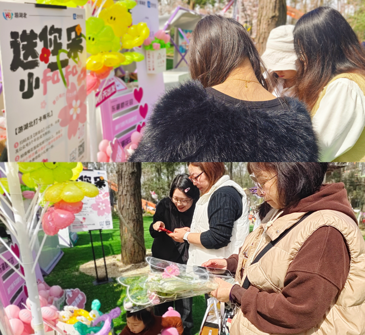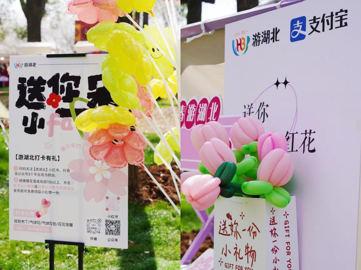 活動現(xiàn)場,游客們只需掃碼關(guān)注“游湖北”新媒體矩陣賬號,并分享賞櫻圖片或視頻至社交平臺,即可獲得旺旺布丁/氣球花/氣球花包/花花發(fā)箍等精美禮品。豐富多樣的禮品引來眾多賞花游客圍觀打卡,現(xiàn)場圈粉無數(shù)。