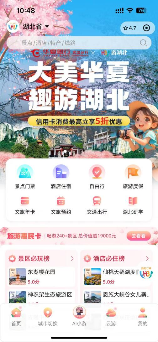 在數(shù)字化消費(fèi)場(chǎng)景深度融合的背景下,雙方構(gòu)建“三重惠民”服務(wù)體系:一是消費(fèi)立減,用戶(hù)通過(guò)“游湖北”微信小程序預(yù)訂景區(qū)門(mén)票、精品酒店、特色年卡及品質(zhì)跟團(tuán)游產(chǎn)品時(shí),使用微信支付(綁定華夏銀行信用卡),可享最高5折優(yōu)惠,單筆立減50元封頂;二是場(chǎng)景互通,整合省內(nèi)熱門(mén)景區(qū)、優(yōu)質(zhì)酒店資源形成消費(fèi)矩陣;三是長(zhǎng)效賦能,通過(guò)“月月享優(yōu)惠”機(jī)制(每自然月限享1次)持續(xù)激發(fā)消費(fèi)活力。