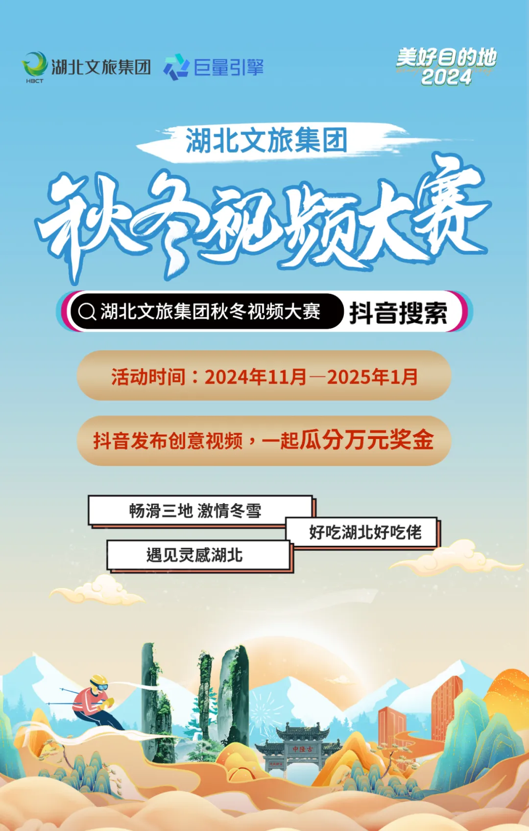 湖北文旅集團正式啟動秋冬視頻大賽,邀您共賞荊楚之美。近日,湖北文旅集團啟動秋冬視頻大賽。此次活動以“遇見靈感湖北 好吃湖北好吃佬”、“暢滑三地 激情冬雪”以及“景區(qū)代言人”為主題,鼓勵廣大網(wǎng)友通過鏡頭記錄湖北的自然風(fēng)光、美食文化及冬季運動的樂趣?;顒幼?024年11月開始,將持續(xù)至2025年1月底。參賽者需在其個人抖音賬號上發(fā)布符合任一主題要求的原創(chuàng)視頻,并使用官方指定話題標(biāo)簽“#湖北文旅集團秋冬視頻大賽”,同時添加參與拍攝內(nèi)容所涉及的湖北文旅集團旗下任意景區(qū)的位置信息。此次活動不僅是對湖北豐富旅游資源的全面展示,也為廣大攝影愛好者提供了展現(xiàn)才華與創(chuàng)意的舞臺。