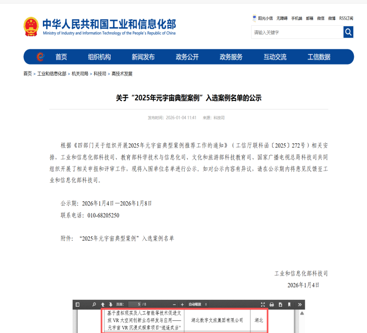 首例!數(shù)旅集團“逍遙武當”項目躋身兩項全國典型案例名單。近日,工業(yè)和信息化部科技司、教育部科學技術與信息化司、文化和旅游部科技教育司、國家廣播電視總局科技司聯(lián)合公布了“2025年元宇宙典型案例名單”;工業(yè)和信息化部辦公廳、文化和旅游部辦公廳、國家廣播電視總局辦公廳、國家知識產權局辦公室、中央廣播電視總臺辦公廳聯(lián)合公布了“2025年度視聽系統(tǒng)典型案例名單”,數(shù)旅集團“逍遙武當”項目在兩項典型案例評選中均成功入選。